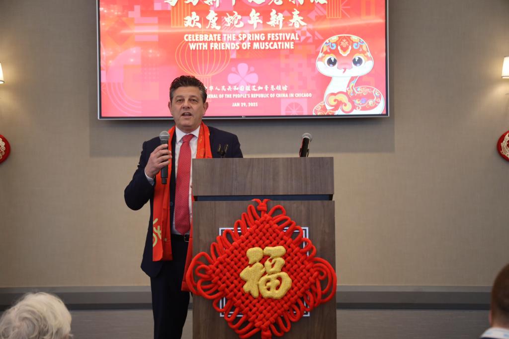 當地時間1月29日,在馬斯卡廷,艾奧瓦州友好委員會董事會成員盧卡·貝隆與中美學生歡度蛇年新春。新華社記者徐劍梅攝