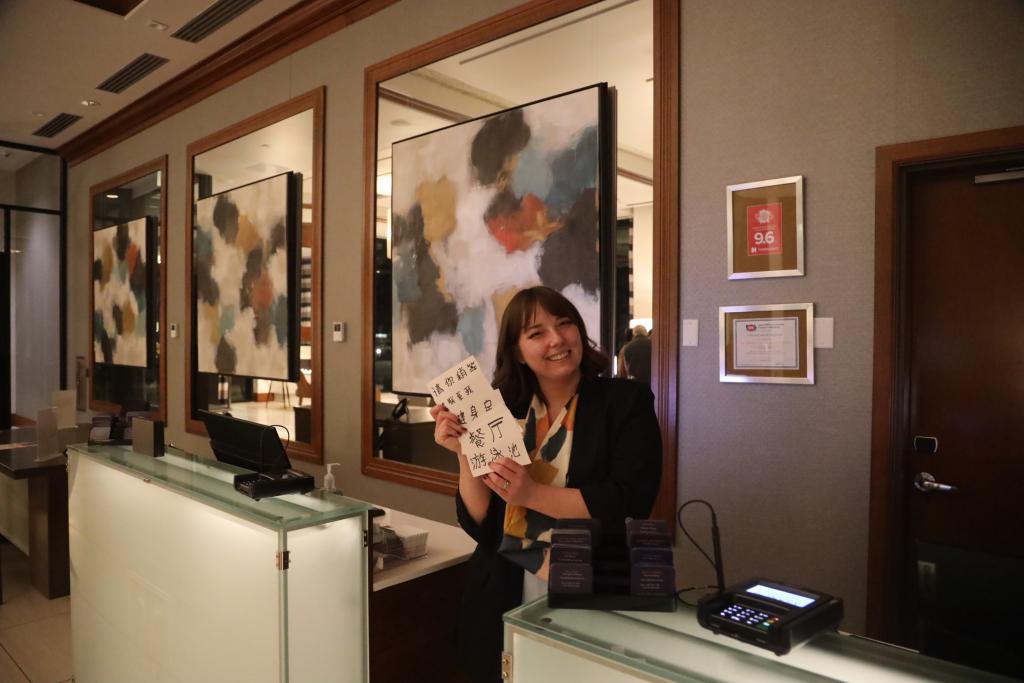 當地時間1月28日,馬斯卡廷一家酒店前臺工作人員謝伊·馬丁展示自己為迎接中國學生而手繪的中文指引卡片。新華社記者徐劍梅攝