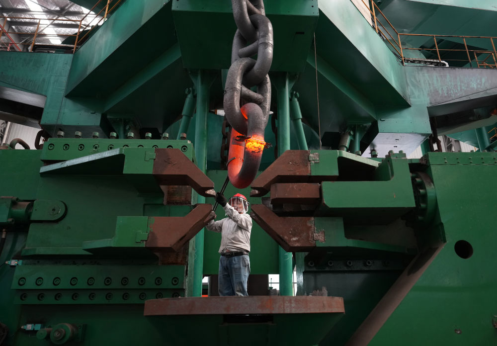 2024年6月4日,江蘇泰州靖江市江蘇亞星錨鏈股份有限公司工人在生產車間作業。該公司前身是40多年前創辦于靖江東興鎮的一個小廠,經過多年發展,逐漸成長為國家級制造業單項冠軍示范企業。目前該公司船用鏈條全國市占率達70%,全球市占率超50%,業務已拓展到海洋鉆井平臺、海洋生產平臺、海上風電設施的系泊錨鏈等領域。