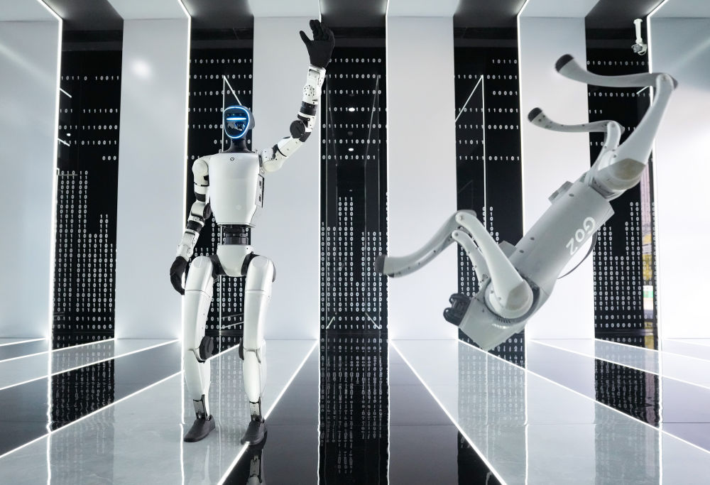 2025年3月1日,在杭州宇樹科技有限公司的產品展示中心,人形機器人和四足機器人在工作人員控制下做動作。人形機器人是人工智能技術的集成體現,在這個未來產業的重要賽道上,一大批中國企業深耕技術、持續創新,國產機器人正在跑出“加速度”。