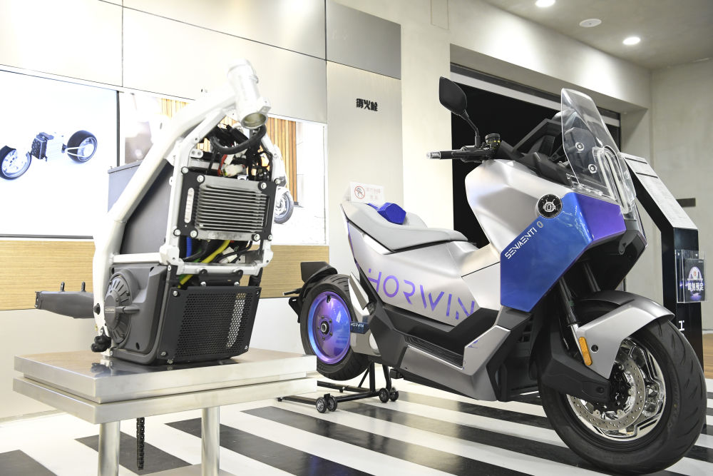 這是在江蘇常州浩萬新能源科技有限公司展廳拍攝的一款電動摩托車(2024年6月1日)。該公司初創于2016年,是一家主打海外市場的智能電動摩托車生產商,產品銷往100多個國家和地區,擁有200多項核心技術專利。近年來,常州著力打造“新能源之都”,從政策、人才等方面提供支持,助力新能源民營企業“走出去”。