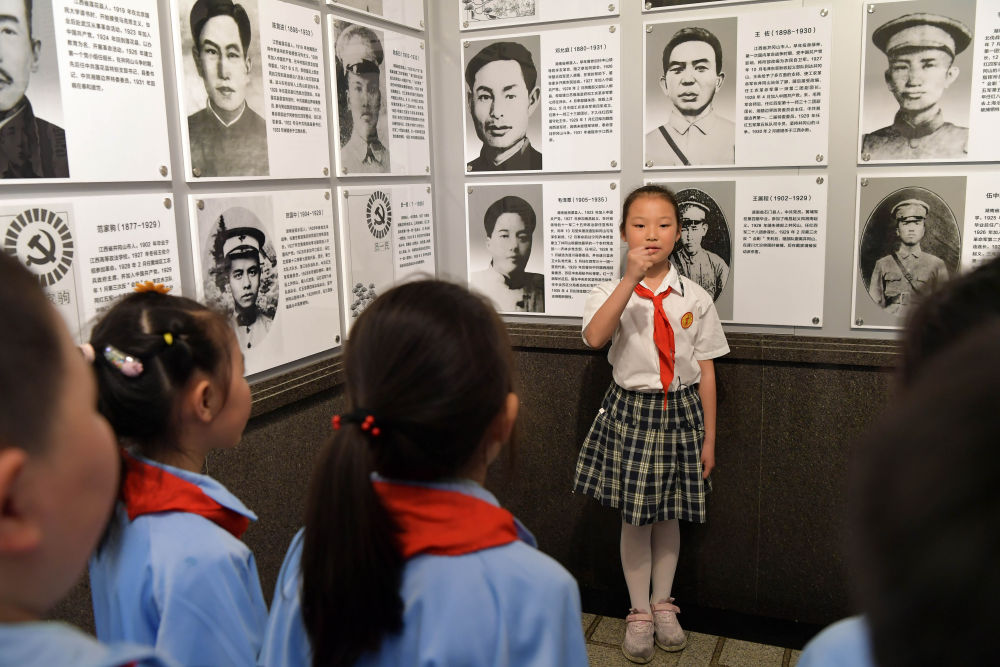 2021年5月12日,在井岡山革命烈士陵園,“小紅軍宣講團”的成員周煜菡給前來參觀研學的學生們進行義務講解。井岡山小學把“紅色德育”作為立德樹人的重要抓手,成立了“小紅軍宣講團”,培養了一批講好紅色故事、傳承先輩精神的小小義務講解員。