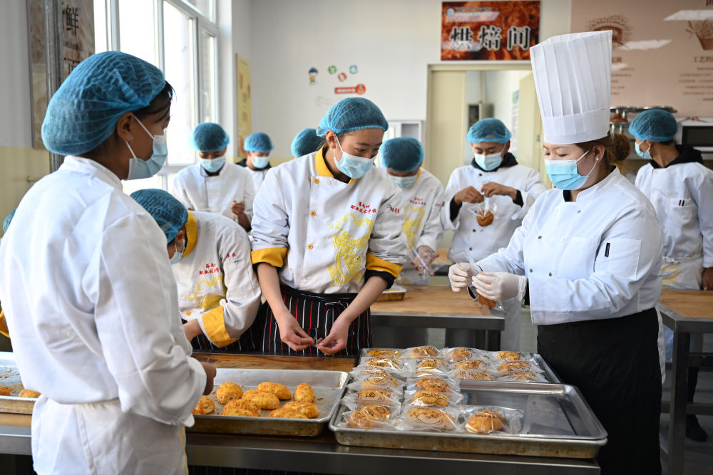 2024年12月17日,青海省海南藏族自治州職業技術學校烹飪專業教師黃雪妍(前右)在指導學生學習西點烘焙。近年來,青海省海南藏族自治州加大職業技術人才培養力度,開設藏醫藥、汽車維修、烹飪等專業,通過推進學校與企業聯合辦學,創新校企合作、定向培養等辦學模式,拓寬職業教育畢業生就業渠道。