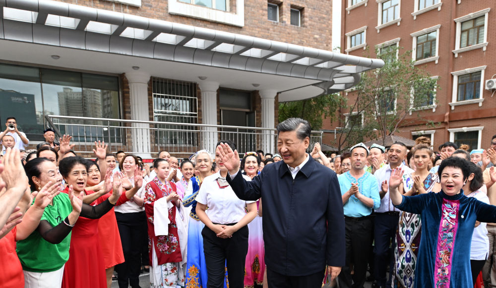 2022年7月13日上午,習近平在新疆烏魯木齊市天山區固原巷社區考察時,身著民族服裝的各族群眾簇擁在總書記身邊,載歌載舞,向總書記表達由衷的愛戴。
