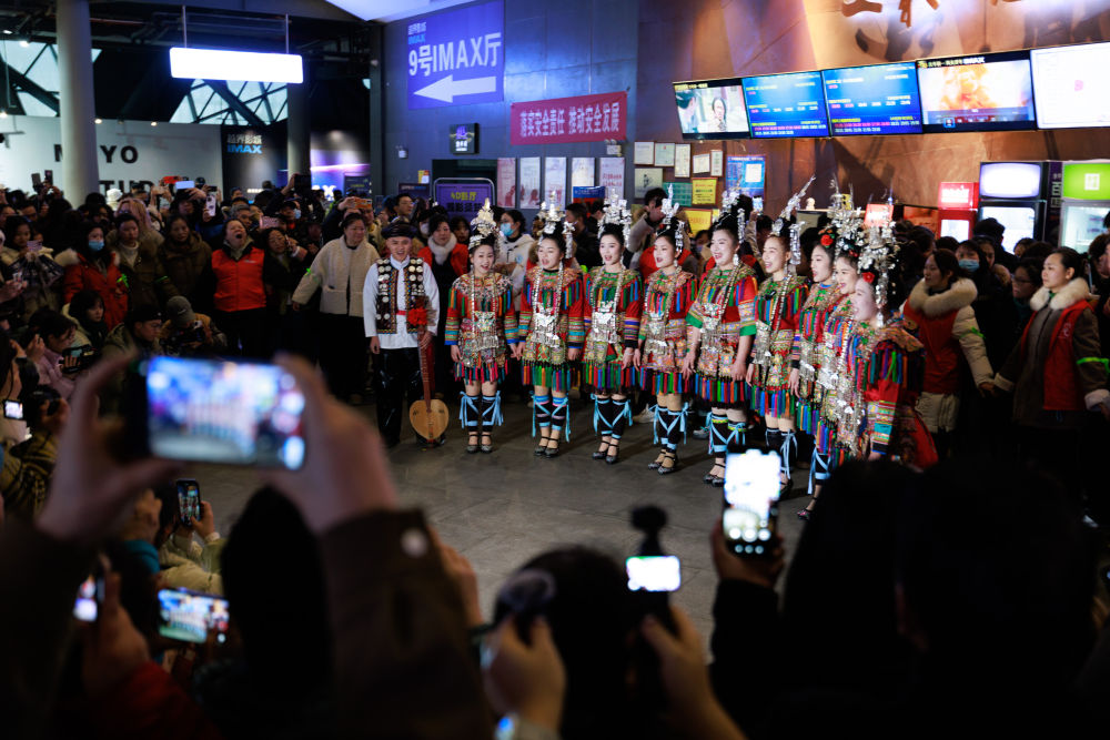 2025年2月25日,電影《哪吒2》上映期間,演員在貴州貴陽一家影城表演侗族大歌。