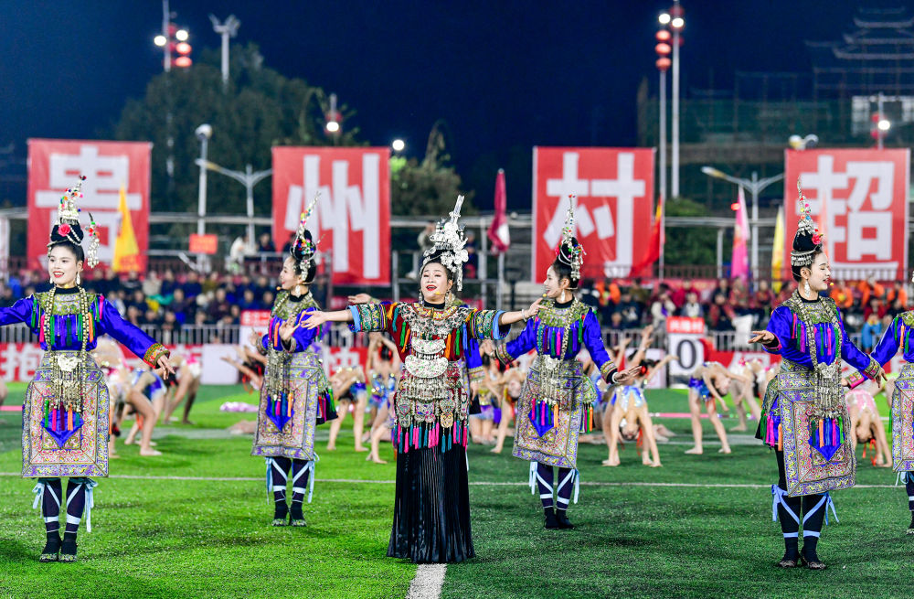 2025年3月14日,2025年貴州“村超”40強交叉賽在榕江“村超”足球場舉行,演員在比賽間隙表演侗族大歌,民族文化伴隨著體育賽事成功“出圈”。