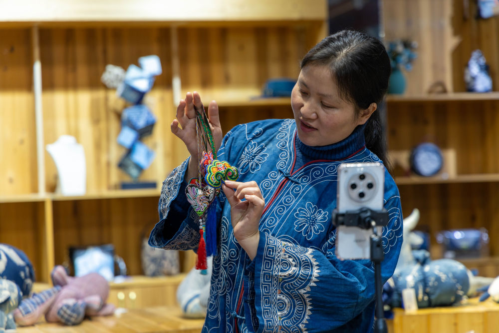 2025年3月14日,村民在肇興侗寨內通過手機直播銷售刺繡作品。侗繡承載著侗族人的信仰與記憶,年輕繡娘的手藝多半來自母親傳承,侗族婦女用一針一線將民族古老的神話傳說、歷史風俗記錄在服飾的紋樣里,讓這門手藝在侗鄉世代傳承。2011年,侗族刺繡被列入國家級非物質文化遺產名錄。