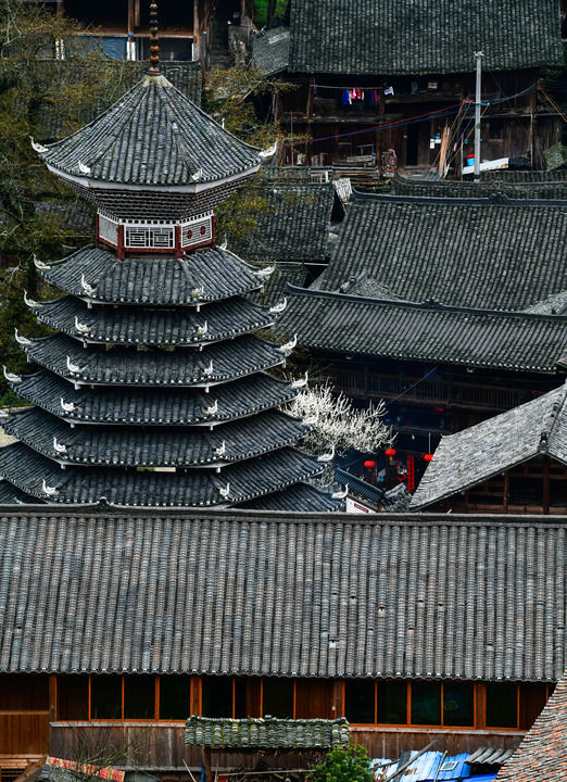 2024年3月17日拍攝的貴州省榕江縣栽麻鎮大利侗寨鼓樓。鼓樓是侗族的文化符號之一,每個侗寨至少有一座,是侗族人民集中議事、評斷是非的公共場所,也是侗家人出生和去世時必須要停留的場地。
