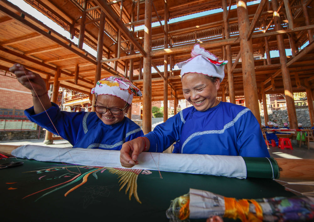 2021年9月27日,貴州省鎮遠縣報京鄉報京村村民邰木香(右)在制作侗繡。邰木香將侗族的民間故事以刺繡形式展現出來,還先后開發出傳統與現代相結合的侗族服飾、工藝包、繡花鞋、圍腰、頭巾、枕巾等系列產品,深受國內外客商的青睞,致富的同時帶動當地300多名繡娘實現就業增收。