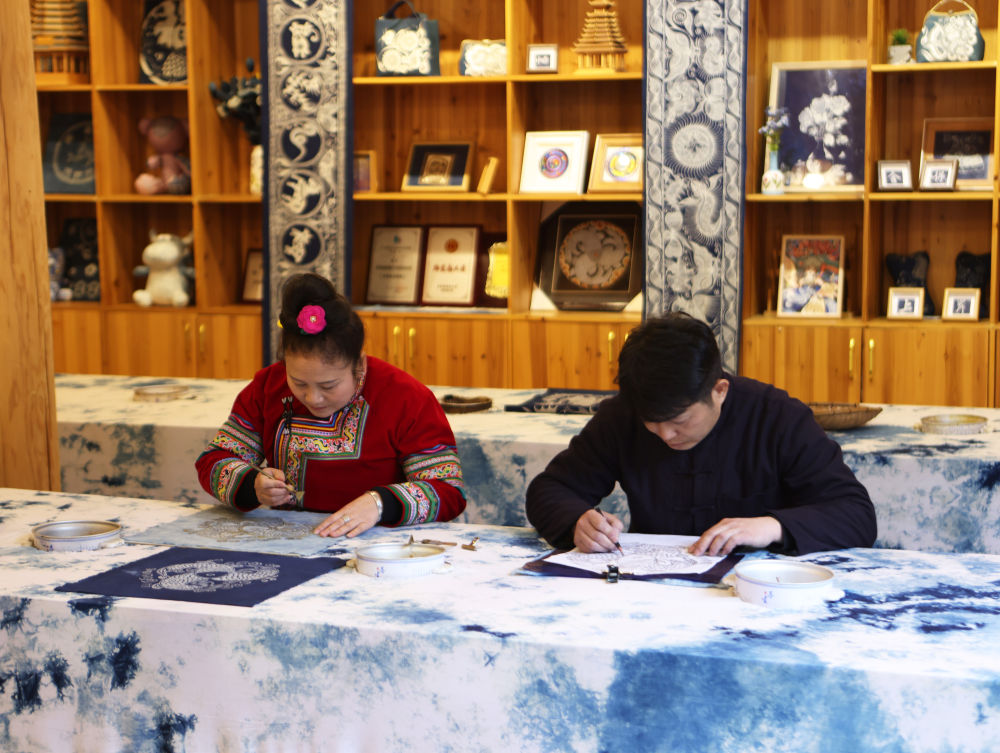 2025年3月14日,村民在肇興侗寨內制作蠟染。近年來,當地加大對少數民族非遺文創產品的研發和創新力度,同時進一步加強線上銷售,通過微信、網上直播、網店等方式進行帶貨,讓當地群眾通過指尖增收致富。
