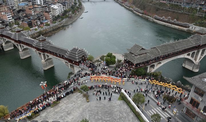 2024年2月22日,在貴州省黔東南苗族侗族自治州錦屏縣,舞龍隊經過兩座風雨橋的交匯處。風雨橋,又稱“花橋”,是侗族的標志性建筑之一。因橋上建有廊和亭,既可行人又可遮蔽風雨,故稱風雨橋。其以木為料、以榫銜接,是侗族橋梁建筑藝術的結晶。鼓樓、花橋的侗族木構建筑營造技藝被列入國家級非物質文化遺產代表性項目。