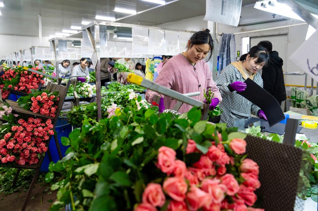 近日,花農在分揀包裝車間內包裝鮮花。新華社記者 陳欣波 攝