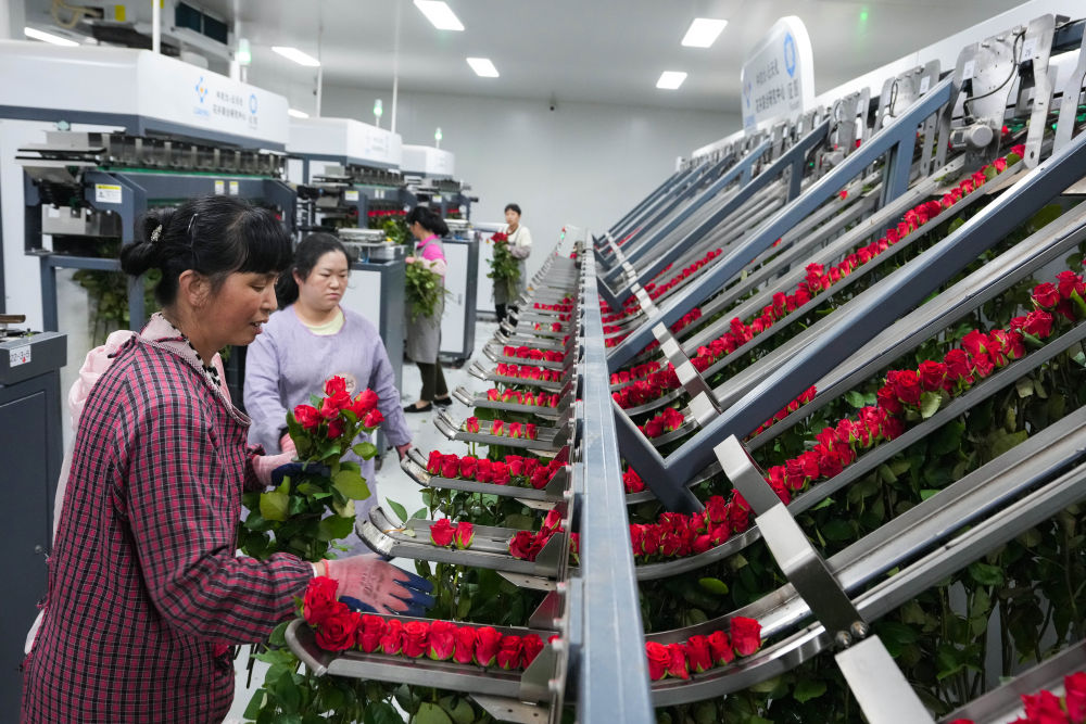 2024年8月23日,在云南晉寧花卉產業現代化示范園采后處理中心,花農將鮮切花自動分揀流水線上分揀好的鮮花取下,準備放入包裝流水線。