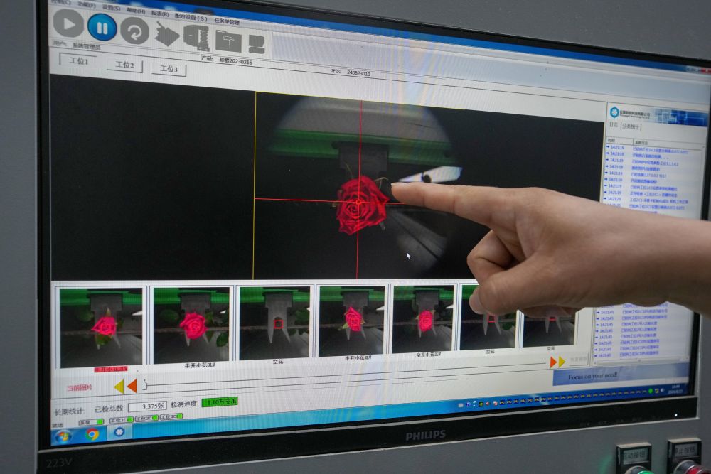 2024年8月23日,在云南晉寧花卉產業現代化示范園采后處理中心,計算機在實時監測自動分揀流水線上的鮮切花。
