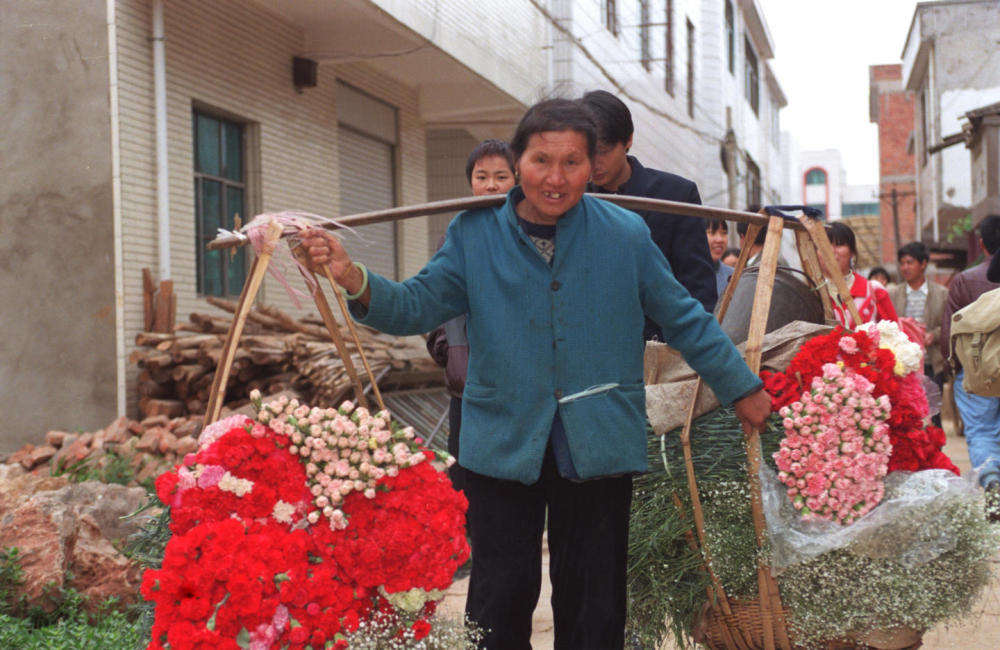 云南省昆明市呈貢龍街鄉斗南村是中國有名的“花鄉”,全村幾乎家家種花。這是一位當地花農挑著一擔鮮花去花卉交易市場出售(1999年6月2日發)。