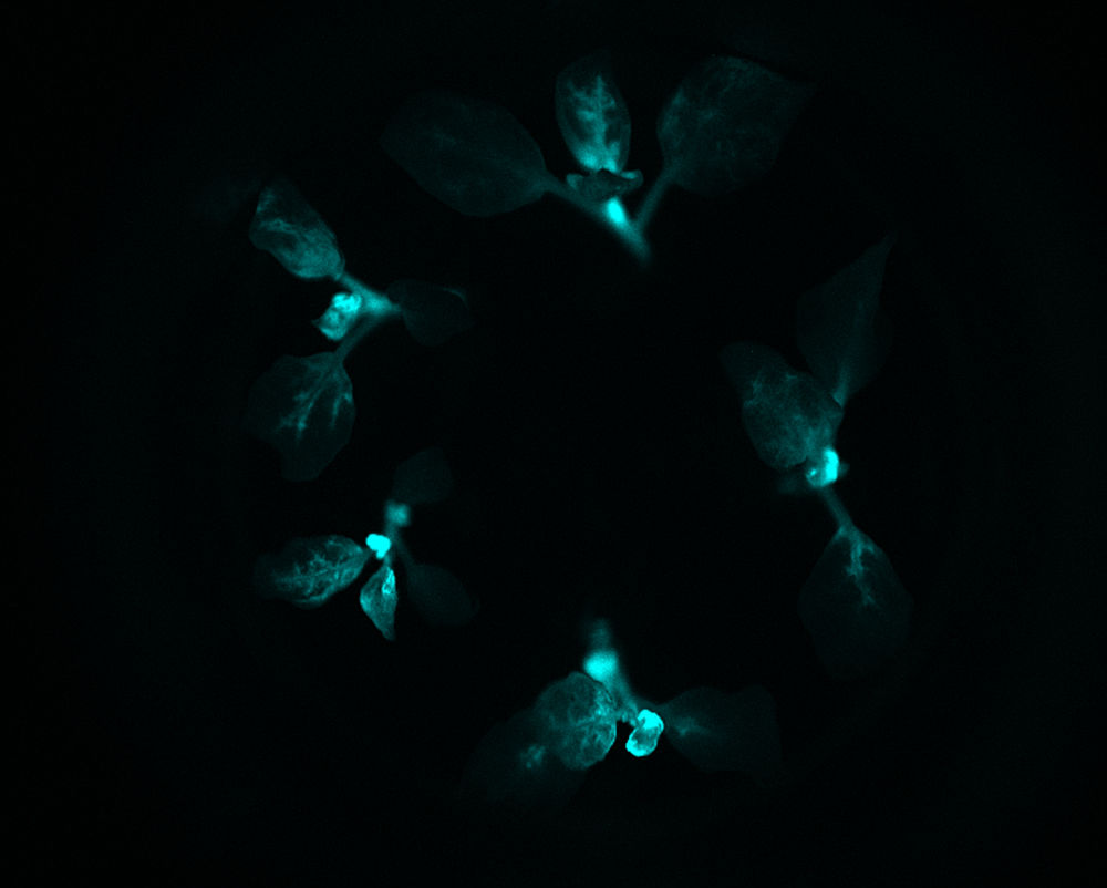 這是云南某農業研發團隊利用基因技術成功培育出肉眼可見的“自發光植物”在黑暗條件下發光(2017年6月21日攝)。