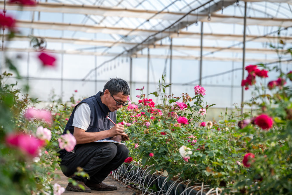 2023年10月20日,在云南省安寧市現代農業園區玫瑰種植示范園,技術員田連通在記錄太空育種玫瑰花編號。