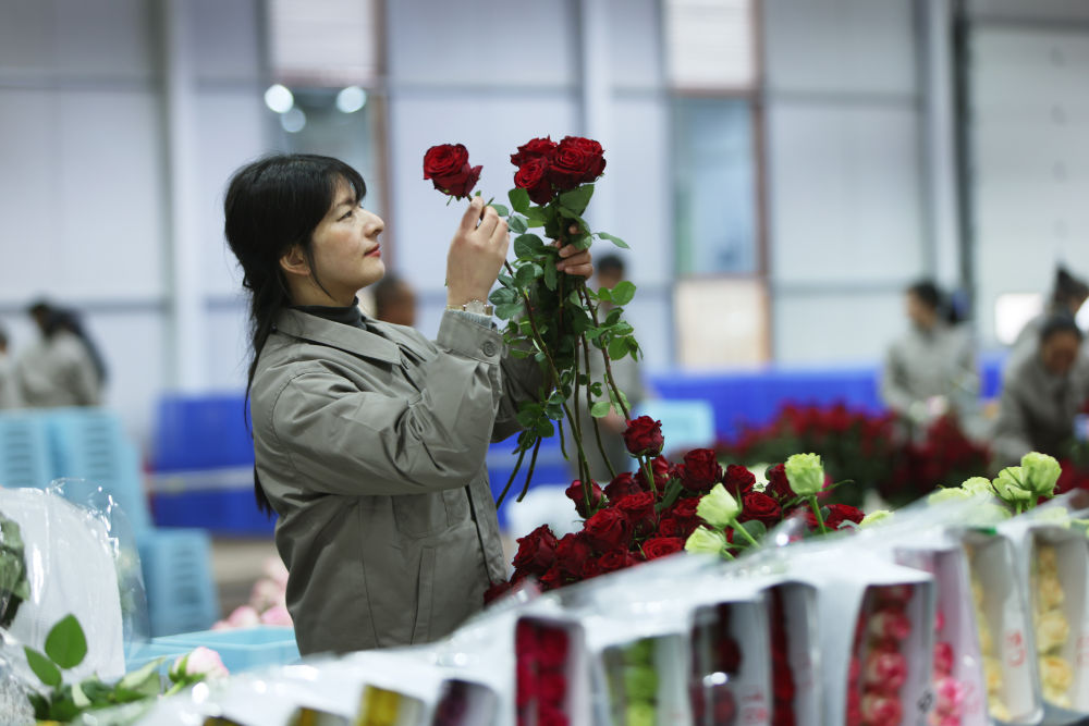2017年2月14日,消費者在云南省昆明市斗南花卉市場選購玫瑰花。