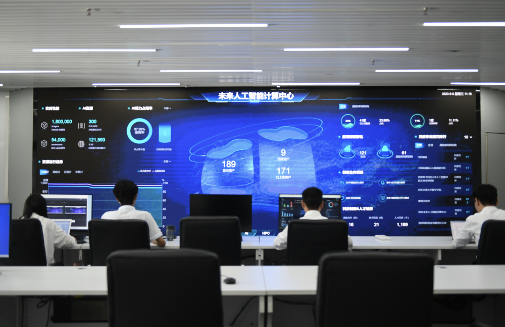 2023年9月6日,在陜西西安的未來人工智能計算中心監控運維室,工作人員通過智慧大屏監測平臺運行情況。