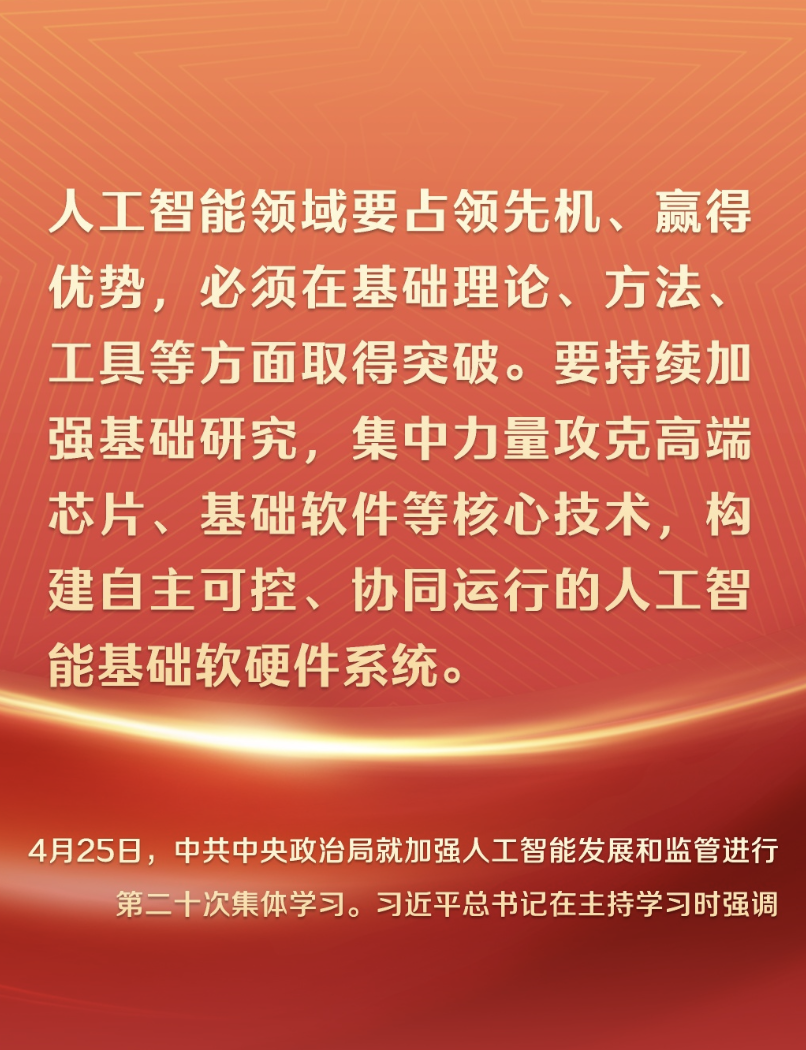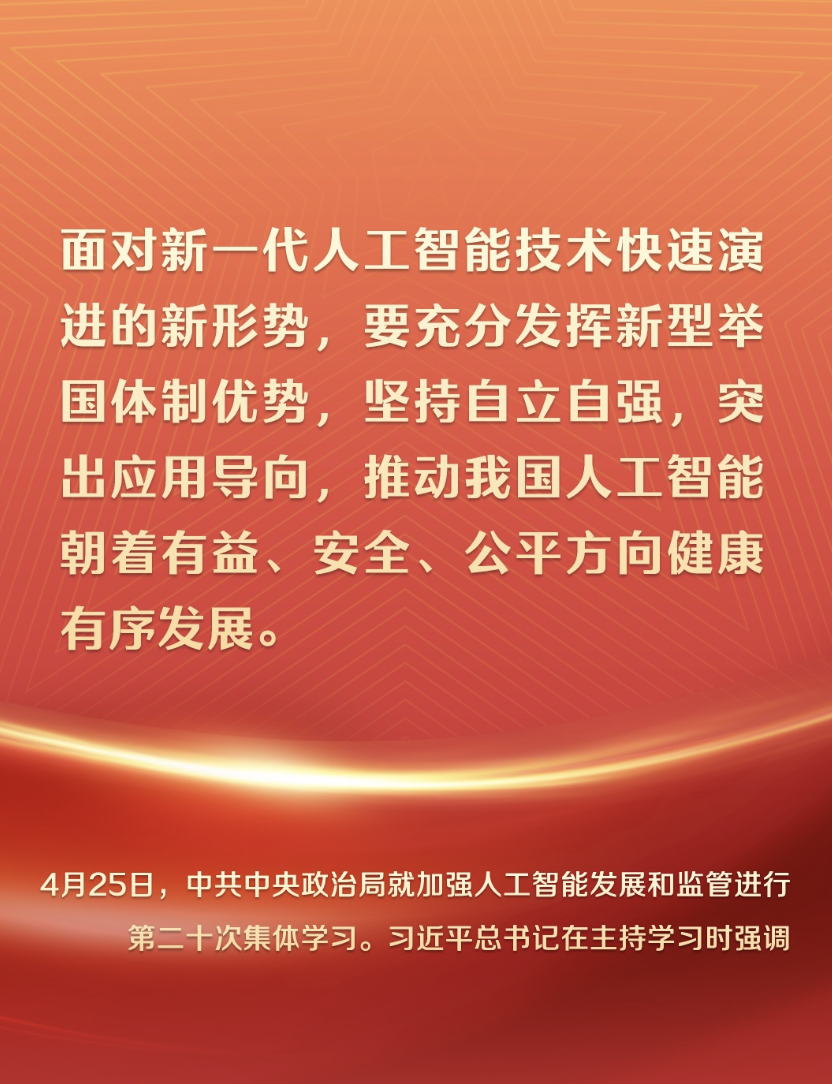 就在4天前,4月25日下午,中共中央政治局就加強人工智能發展和監管進行第二十次集體學習。習近平總書記在主持學習時強調: