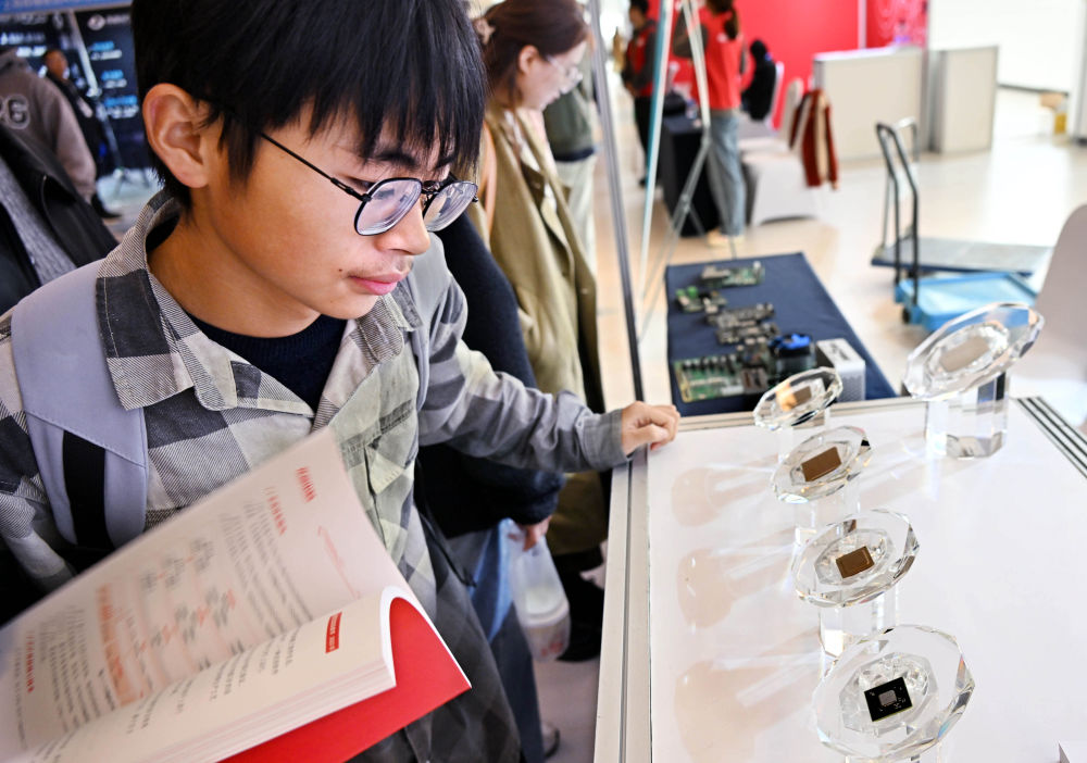 2024年11月2日,與會者在2024中國自動化大會展覽區觀看國產芯片。當日,2024中國自動化大會在山東省青島市開幕。大會以“新質發展 智控未來”為主題,聚焦自動化與人工智能深度融合,探討新產業、新技術的創新發展。