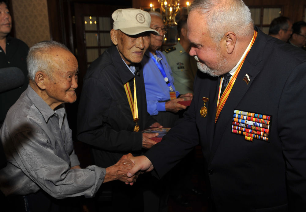2015年9月5日,二戰蘇軍著名統帥瓦西里·崔可夫的外孫尼古拉·崔可夫(前右)與中國抗戰老兵代表在活動現場交流。新華社記者 魯鵬 攝