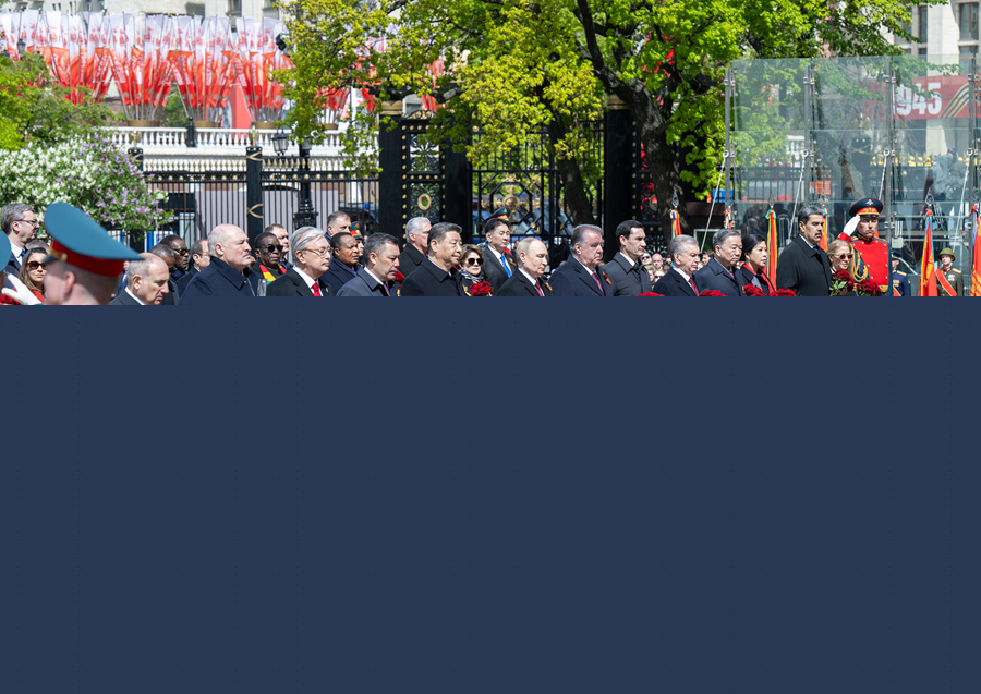 當地時間5月9日,俄羅斯舉行盛大慶典,紀念蘇聯偉大衛國戰爭勝利80周年。國家主席習近平和來自世界20多個國家及國際組織領導人應邀出席慶典。慶典結束后,習近平同其他國家領導人一起從紅場來到亞歷山大花園,向無名烈士墓獻花,并肅立默哀。