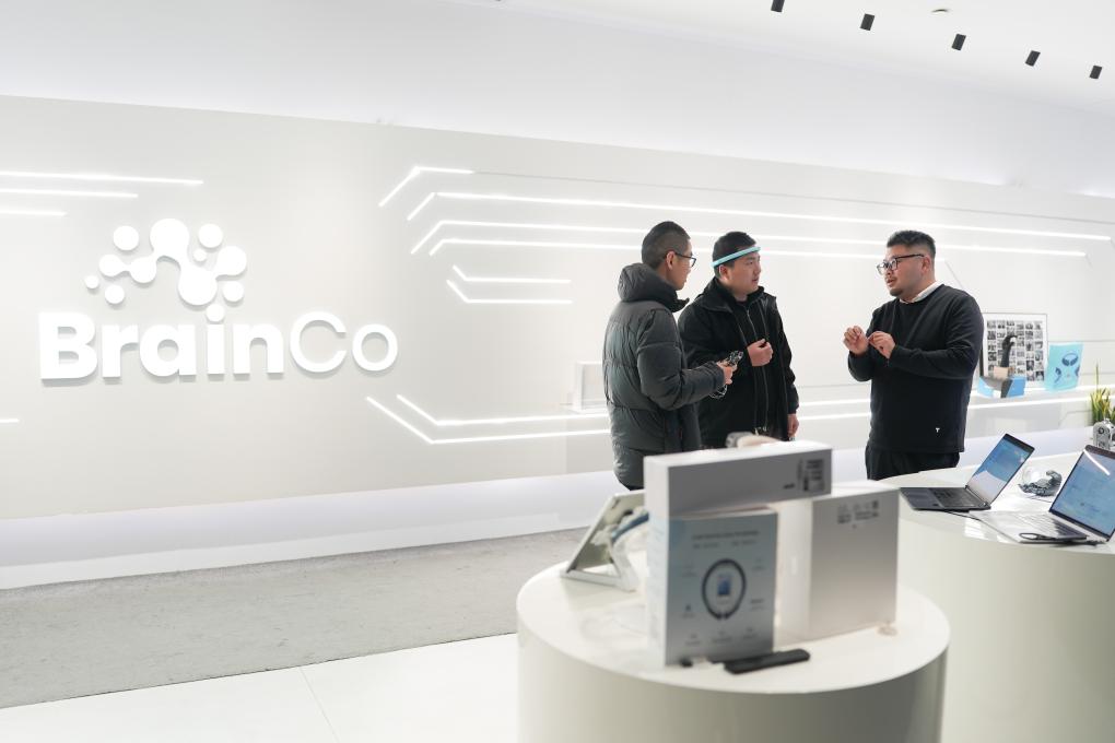 浙江強腦科技有限公司創始人韓璧丞(右一)與團隊技術人員討論產品設計(2月26日攝)。新華社記者 黃宗治 攝