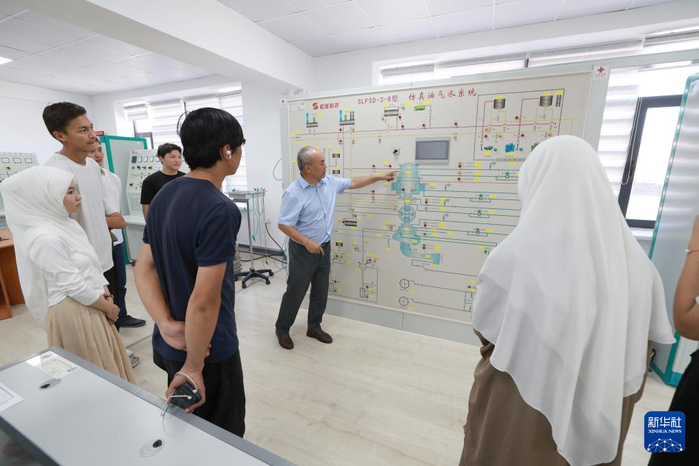 6月4日,在吉爾吉斯斯坦首都比什凱克,吉爾吉斯斯坦魯班工坊負責人阿克爾別克·奇梅羅夫(后中)在魯班工坊電力系統綜合自動化實驗室向學生講解仿真油氣水系統。新華社發(羅曼攝)