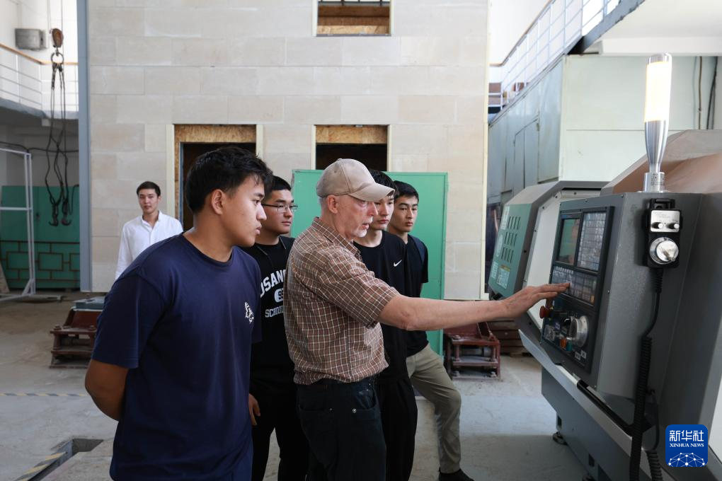 6月4日,在吉爾吉斯斯坦首都比什凱克,師生在吉爾吉斯斯坦魯班工坊水利工程材料檢測實驗室操作數控車床。新華社發(羅曼攝)