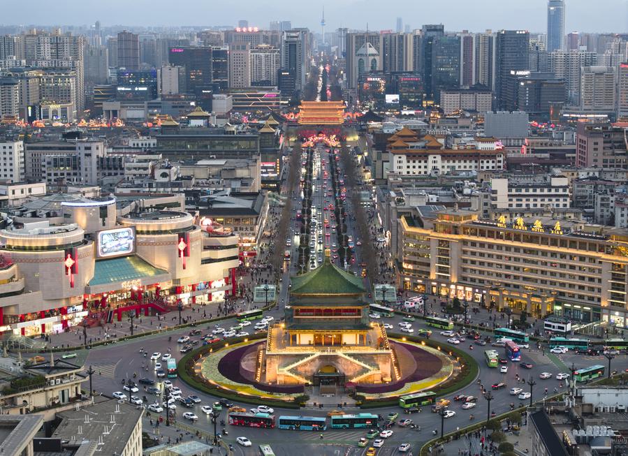3月19日,空中俯瞰西安鐘樓、南門商圈(無人機照片)。陜西省西安市是古絲綢之路的起點,自古以來便是商貿往來的重要樞紐。新華社記者邵瑞攝