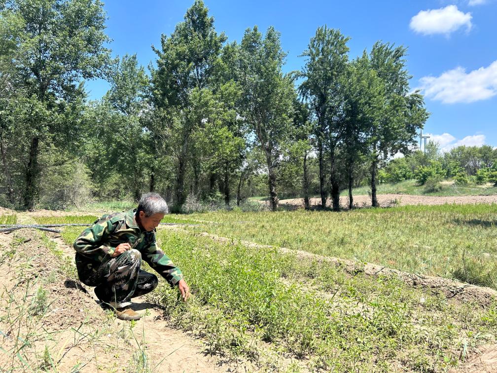 遼寧省阜新市彰武縣四合城鎮劉家村村民侯貴正在拔除影響枸杞苗生長的雜草(2025年6月4日攝)。新華社記者 高爽 攝