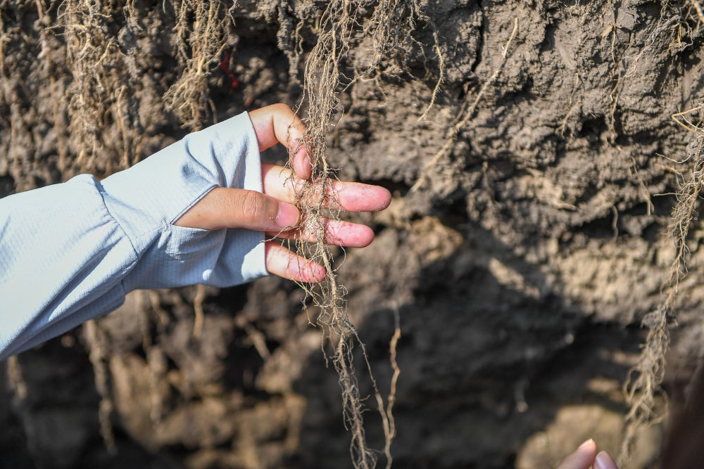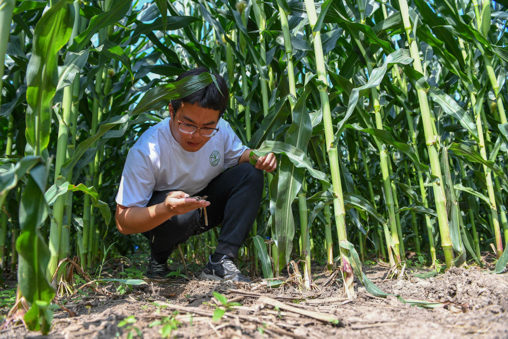 2023年7月31日,在位于吉林省四平市梨樹縣的中國農業大學“科技小院”保護性耕作試驗田,一名學生查看玉米根部在黑土中的生長情況。