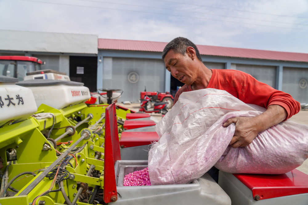 2020年5月7日,在吉林省四平市梨樹縣康達農機農民專業合作社,農民向免耕播種機里投放玉米種子。