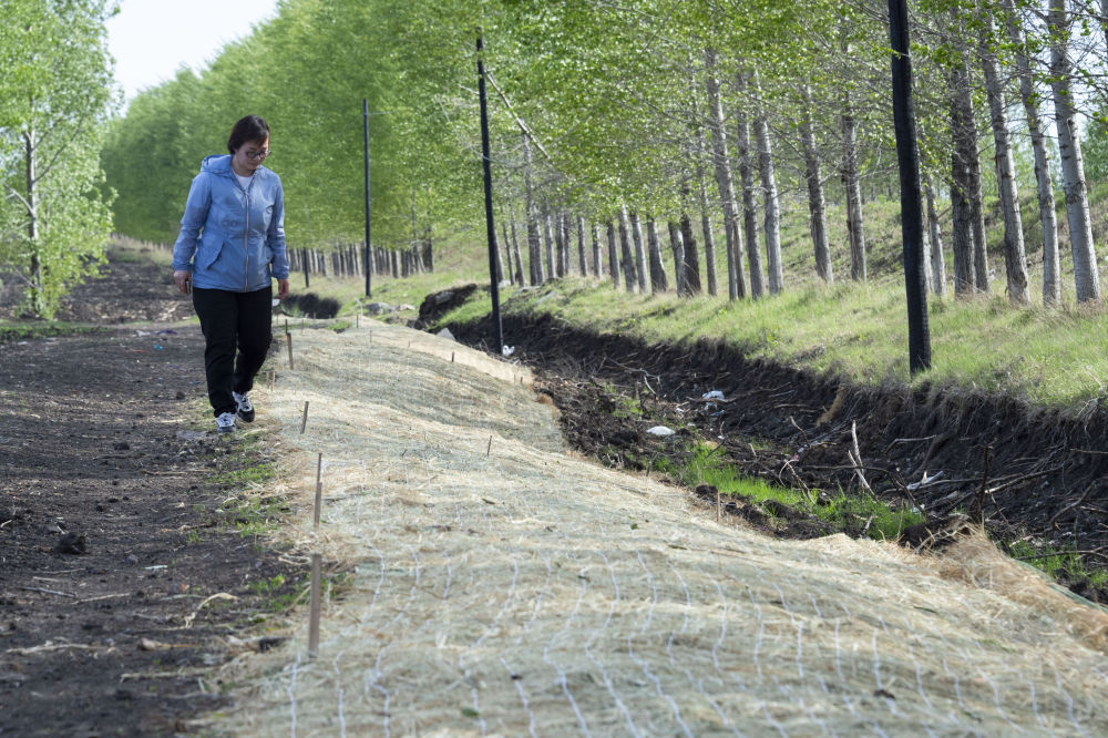 2022年5月23日,在黑龍江省海倫市前進鎮光榮村,黑龍江省農業科學院科研人員在進行坡面生態修復的黑土坡耕地中查看治理情況。
