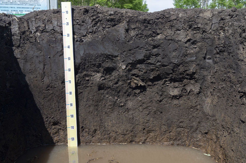 黑龍江省海倫市前進鎮自新村農業科技示范基地內一處用來觀測黑土層厚度的土壤剖面(2022年5月23日攝)。