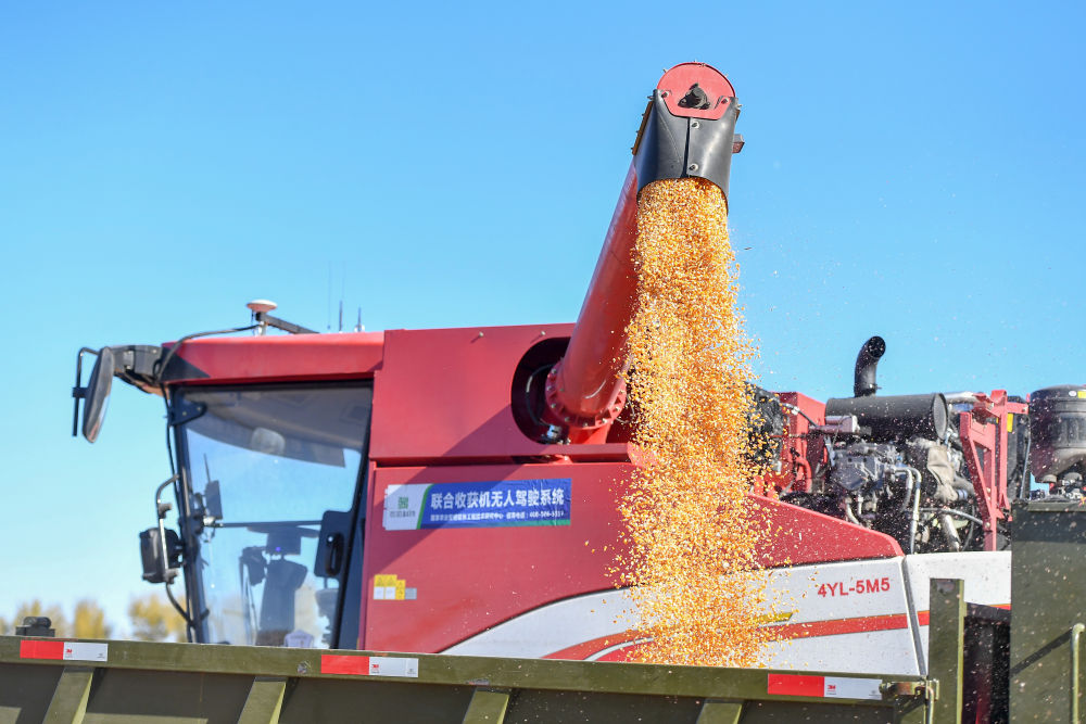 2023年10月19日,在中國科學院“黑土糧倉”科技會戰長春示范區公主嶺示范基地,無人駕駛農機將收獲的玉米裝車。