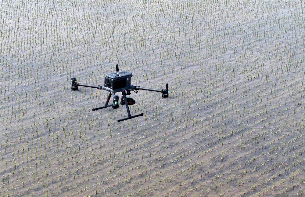 2025年5月21日,在黑龍江省北大荒農業股份八五六分公司第六管理區農業現代化示范區,搭載多光譜、可見光攝像頭的無人機對水稻插秧后田塊進行土壤墑情監測(無人機照片)。