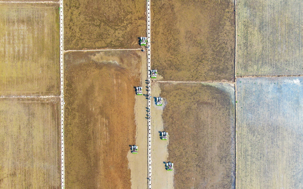 2022年5月13日,在遼寧省鐵嶺市鐵嶺縣新臺子鎮,農民駕駛農機在稻田里插秧(無人機照片)。