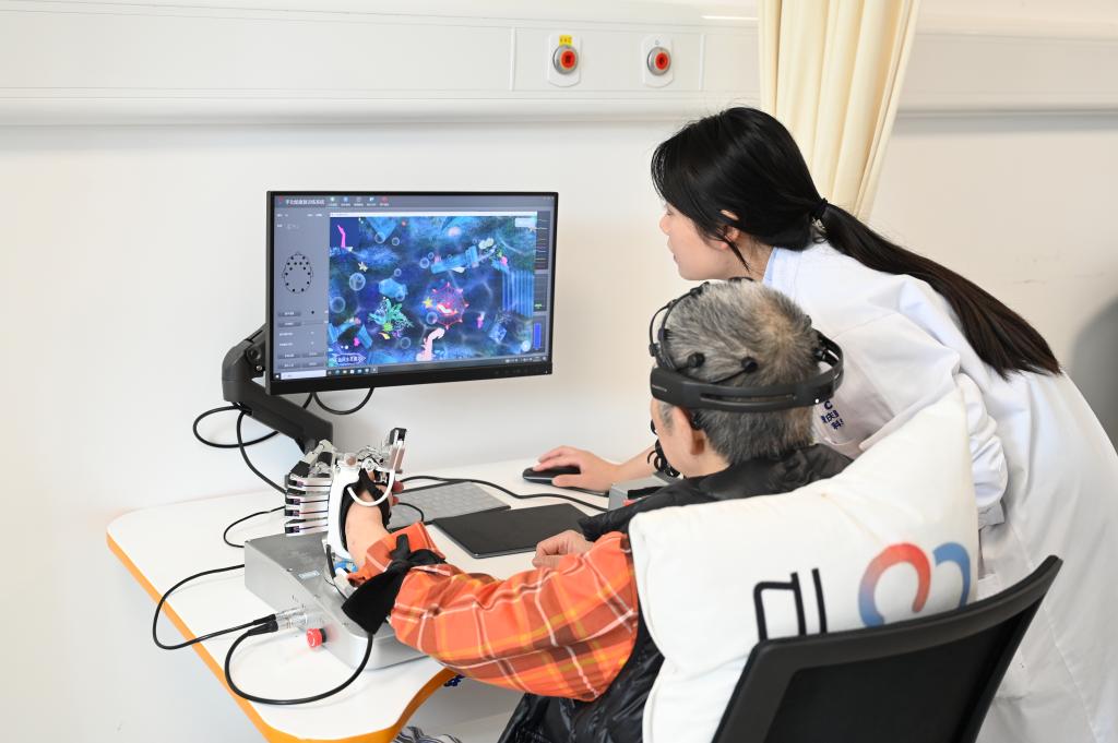 重慶市第五人民醫院的腦機接口康復治療室里,因腦卒中上肢癱瘓的老吳頭戴非侵入式腦機接口裝置,左手在外骨骼機械手臂輔助下完成伸展、合攏……
