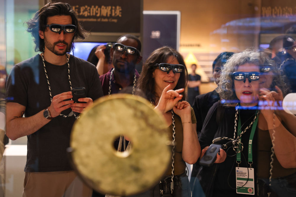 2025年4月23日,第三屆聯合國教科文組織國際博物館高級別論壇的嘉賓使用AR(增強現實)眼鏡參觀良渚博物院展品。
