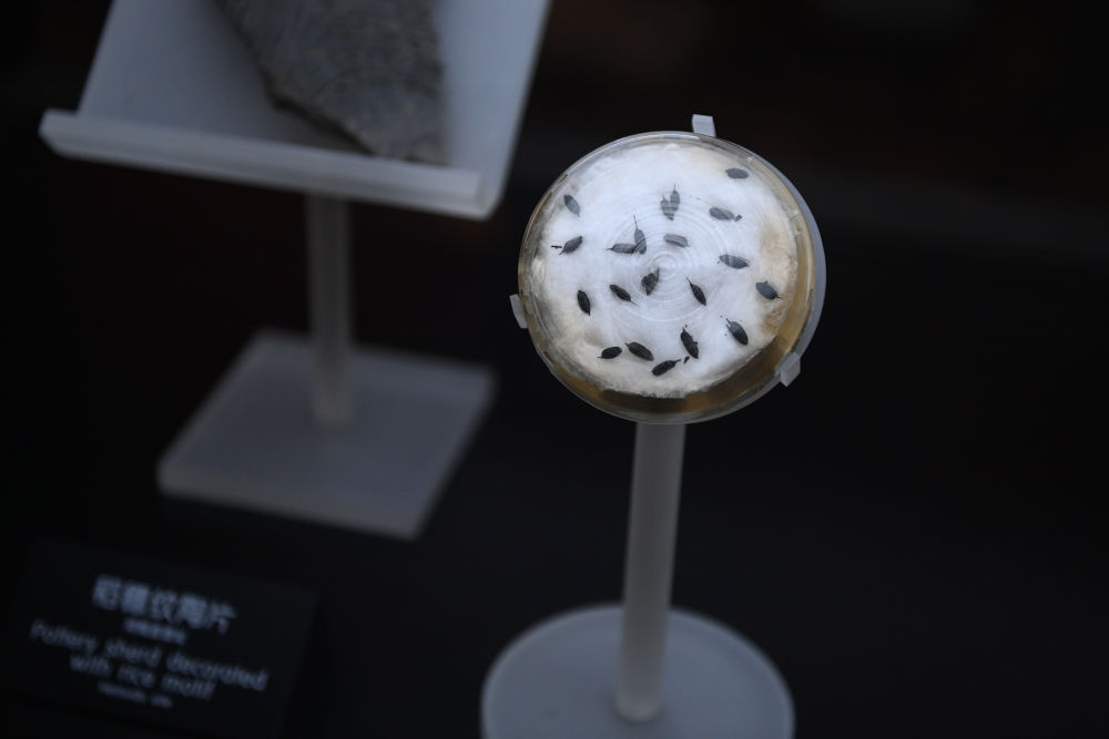 2023年11月3日在浙江省余姚市河姆渡遺址博物館拍攝的出土稻谷。河姆渡遺址距今有7000年至5300年歷史。遺址出土6700余件文物、大量的人工栽培水稻、大片的木構建筑遺跡和豐富的動植物遺存,為研究農業、畜牧、建筑、編織、藝術和中國文明的起源、發展進程提供了極其珍貴的實物資料,2021年入選“百年百大考古發現”。