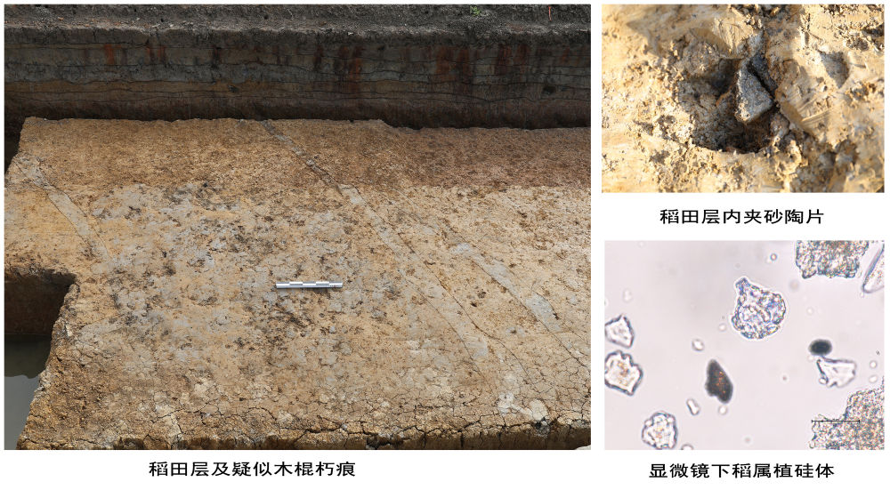 圖為浙江衢州皇朝墩遺址早期稻田遺存及相關依據(拼版照片,資料照片)?;食者z址是一處新石器時代早中期聚落遺址,年代距今約9300—8000年,發現有臺地、環壕及水稻田等重要遺跡,揭示了上山文化至跨湖橋文化時期的稻作農業聚落,是長江下游早期稻作農業社會的生動縮影。