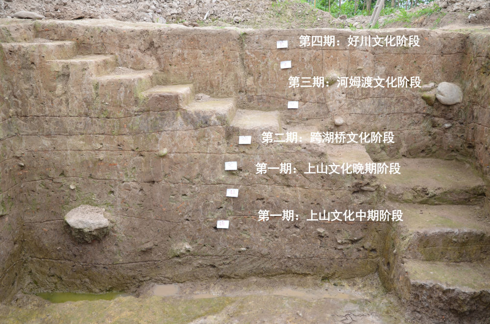 上山文化是長江下游最早的新石器文化,被譽為“世界稻作文化之源”。下湯遺址是上山文化遺址群中最南的一處。遺址全景式呈現了早期農業社會的聚落形態和結構,為我國南方早期稻作農業社會萬年文化史提供了重要實證。這是在浙江仙居下湯遺址的一處探方里,可以清晰看到4個新石器文化階段的遺存(資料照片)。