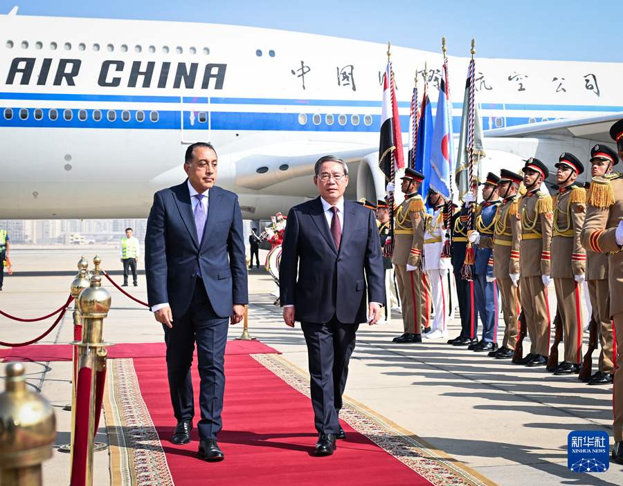 埃及總理馬德布利率政府高級官員到機場迎接,在機場為李強總理舉行歡迎儀式。李強在馬德布利陪同下檢閱了儀仗隊。中國駐埃及大使廖力強也到機場迎接。