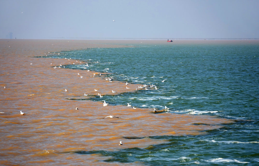 在山東黃河三角洲國家級自然保護區的黃河入???,黃河水與海水形成顏色對比鮮明的獨特景觀(2024年10月11日攝)。