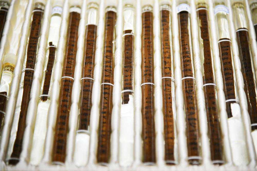 這是在山東博物館展出的銀雀山漢墓出土的《孫子兵法》《孫臏兵法》竹簡(2020年4月28日攝)。