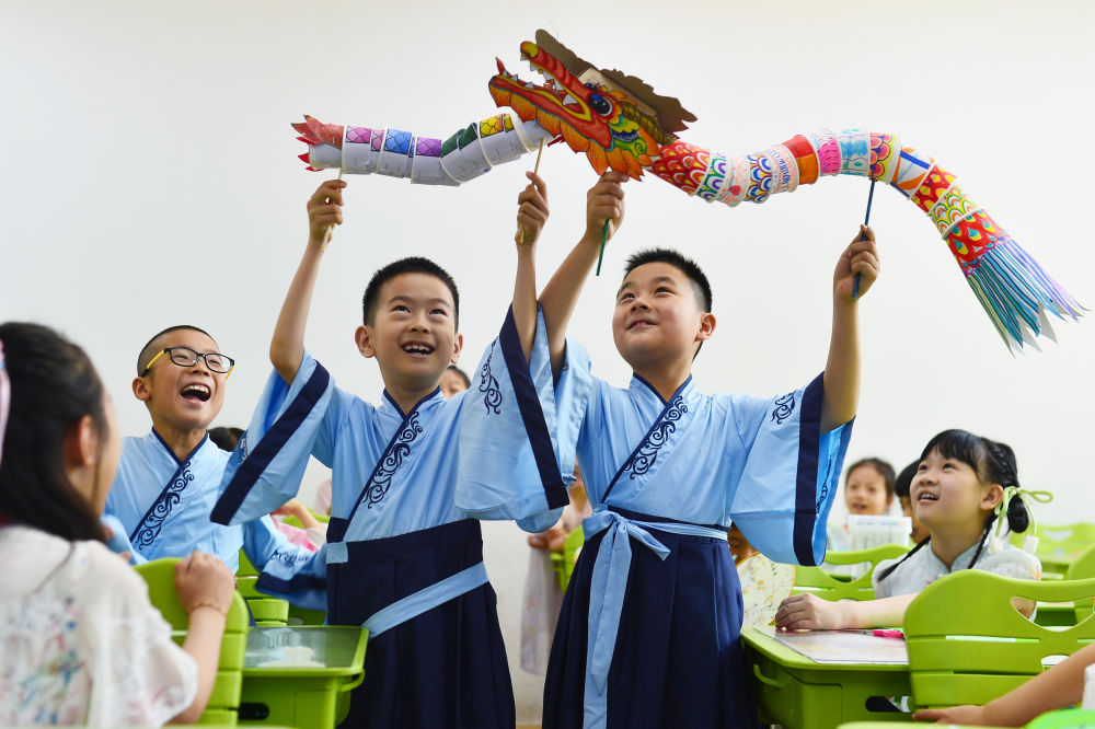 兩名學生在山東省青島市市北區杭州路小學開展的端午文化活動上表演舞龍(2024年6月10日攝)。