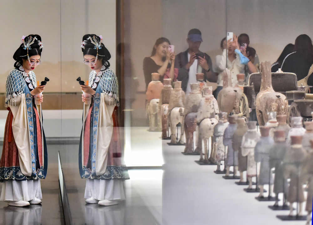 游客在山東省青州博物館拍攝展出的文物,近距離感受歷史和文化的魅力(2025年5月17日攝)。