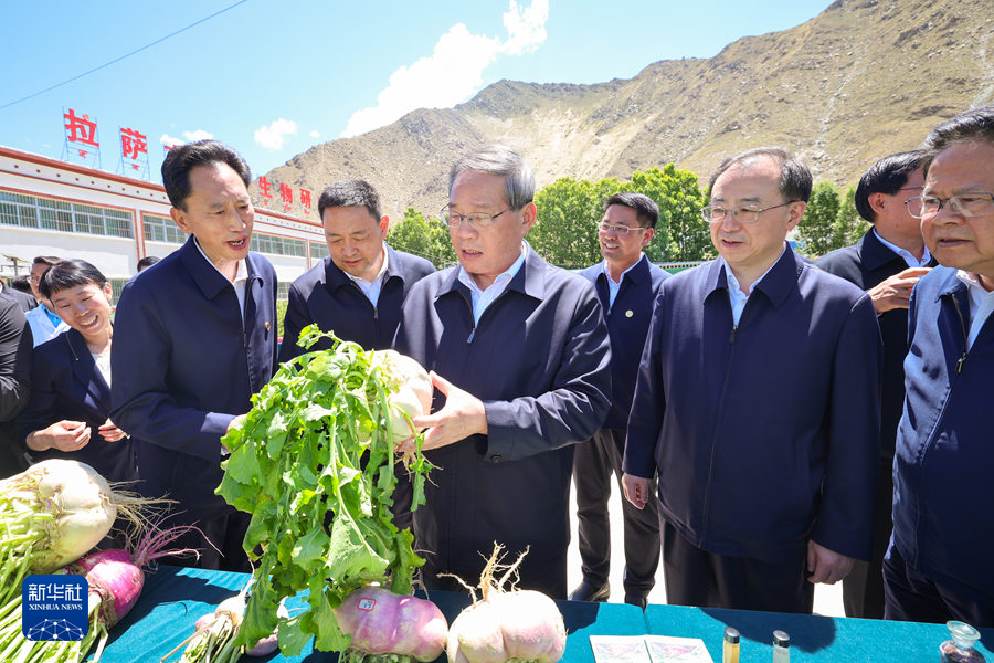 7月18日至19日,中共中央政治局常委、國務院總理李強在西藏調研。這是7月19日在拉薩,李強來到曲水才納國家現代農業示范區,聽取自治區農牧業產業發展、高原生物研究所建設等介紹,觀看示范區自產果蔬、高原特色食飲品、民族手工藝品等展示。